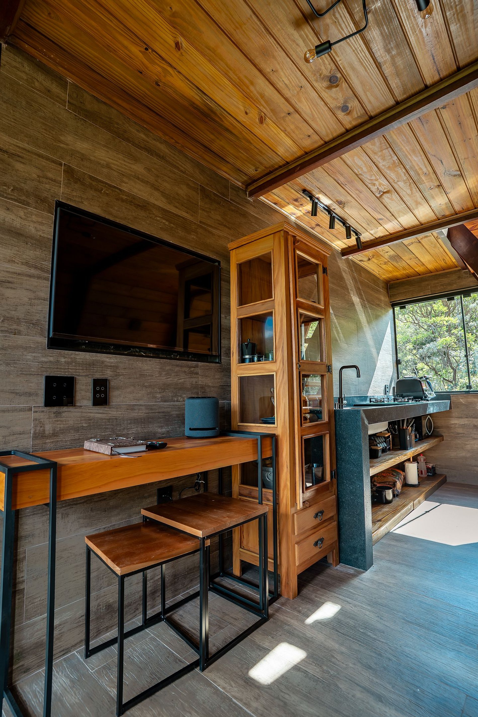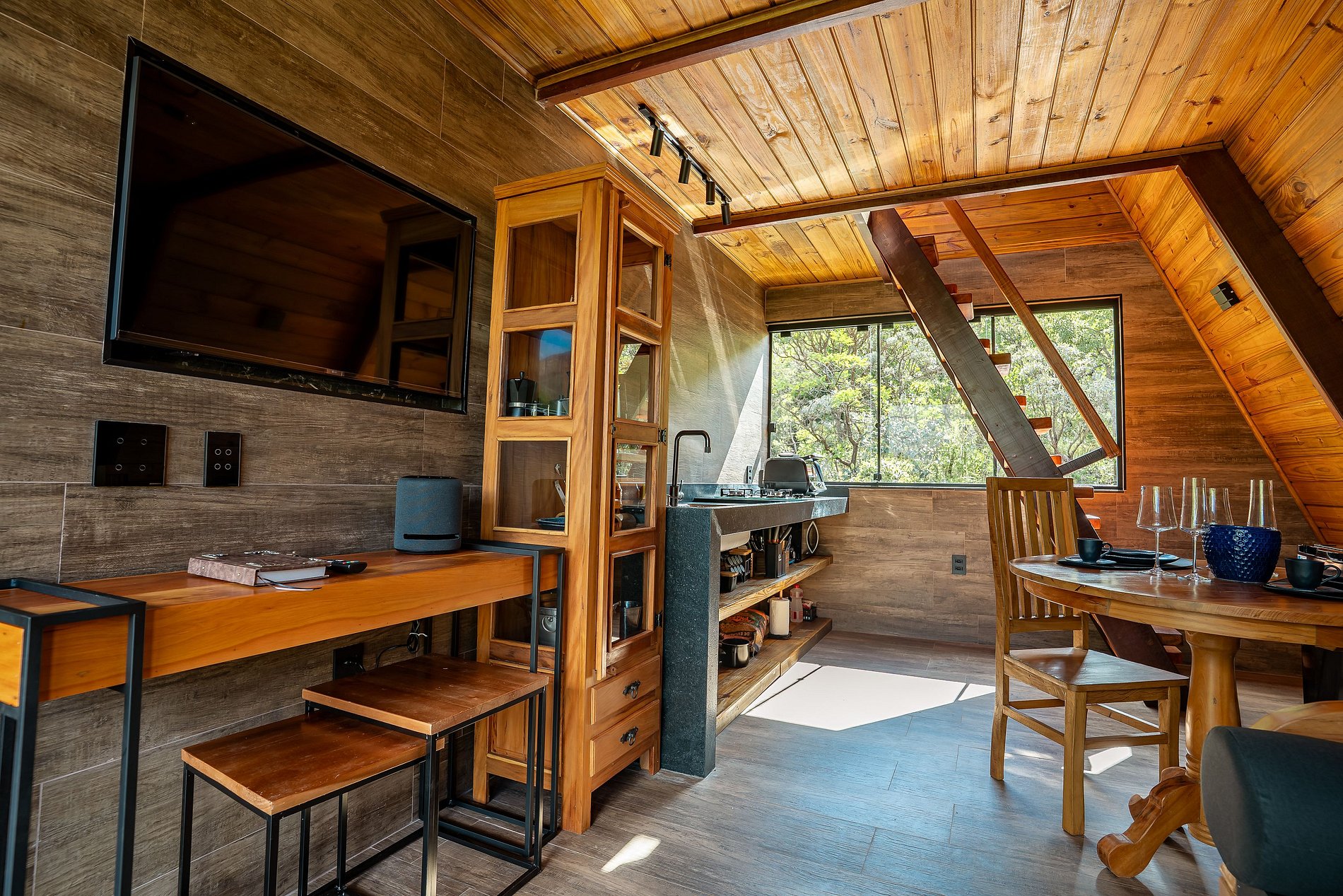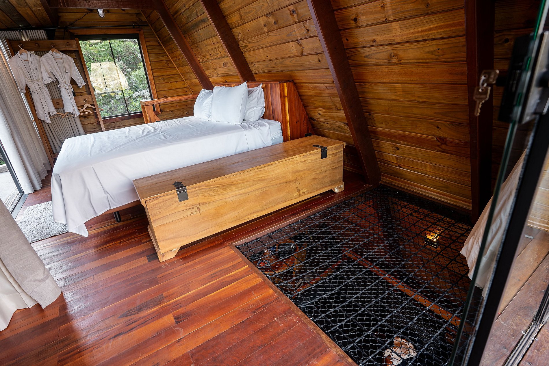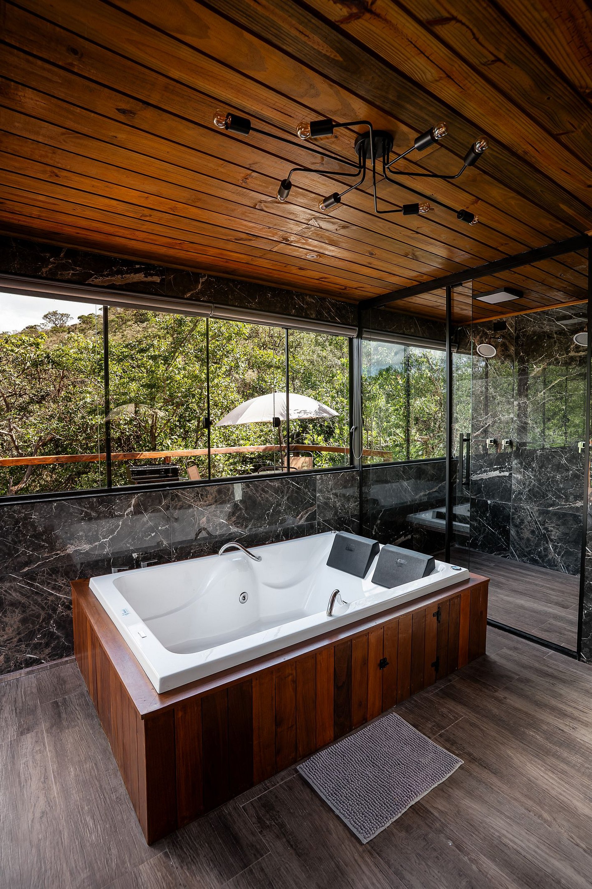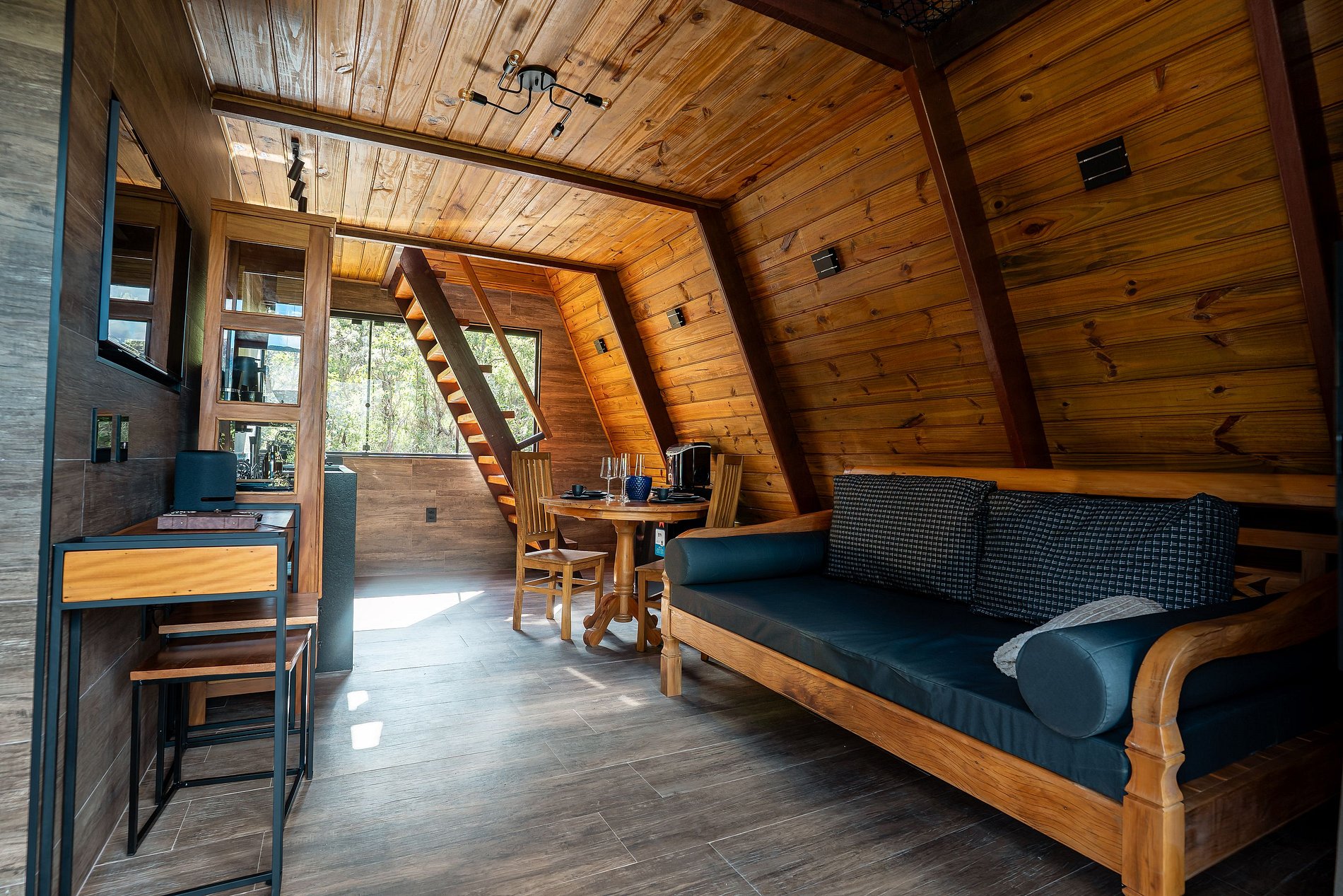 A cabana é suspensa do chão, possui um deck amplo, sala integrada à cozinha que é totalmente equipada, banheiro espaçoso com banheira, duas duchas e vaso sanitário em ambiente separado, proporcionando ainda mais privacidade. No mezanino está o quarto amplo e arejado com cama aconchegante, rede suspensa e uma grande varanda, oferecendo vista de 360° para a deslumbrante Lapinha da Serra. O espaço é totalmente gramado e o grande diferencial da acomodação além da privacidade de estar bem recuado, é a proximidade com a serra, onde, por alguns meses do ano, surge uma pequena cachoeira, permitindo que você se sinta verdadeiramente imerso na natureza.